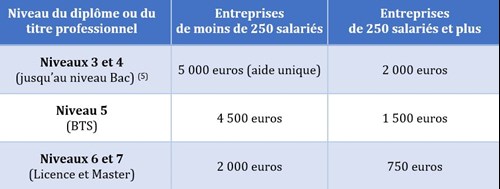 Le montant de l’aide exceptionnelle est modulé en fonction de la taille de l’entreprise et du niveau du diplôme ou du titre à finalité professionnelle préparé (4) :
